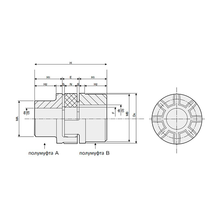 Диаметр чернового отверстия равен 9 мм, максимальный диаметр отверстия полумуфты SGMA равен 24 мм, максимальный диаметр отверстия полумуфты SGMB — 32 мм. Наружный диаметр муфты составляет 55 мм, ширина — 78 мм. Момент инерции — 3 кг/см2.